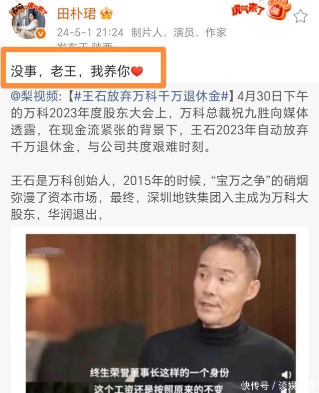面对质疑,王石多次霸气护妻。其中,他最出名的发言就是下面这一段“我认识她的时候,她的现金存款比我还多,是瑞安房地产的大陆顾问,早已非常成功,该是我傍她才对。” 而田朴珺也曾霸气护夫。两年前,王石主动放弃领取千万退休金。她直接转发这则新闻,并留言“没事,老王,我养你。”这一幕不禁让人想起了周星驰与张柏芝在《喜剧之王》里的经典名场面,很感人。